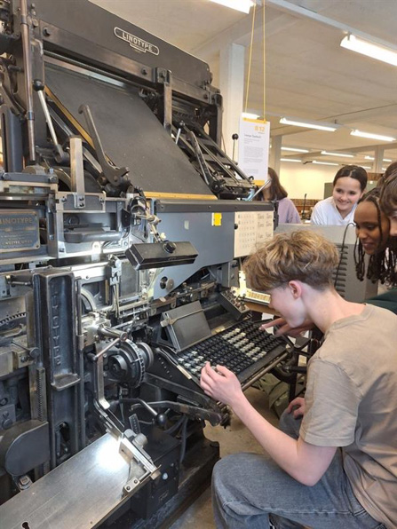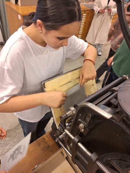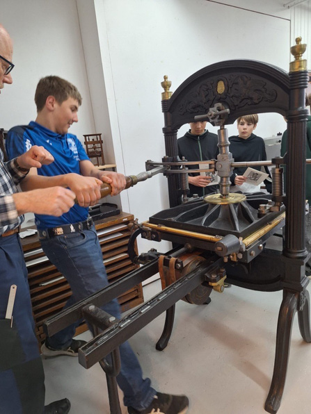 400 Jahre später wurde eine grosse Maschine erfunden, die es den Menschen ermöglichte, viermal so schnell zu schreiben. Wir hatten die Möglichkeit, unseren Vor- und Nachnamen selbst an dieser Maschine giessen zu lassen und dann auf Papier abzudrucken – das fanden die meisten sehr spannend. Ein anderer Drucker konnte vier A5-Seiten auf einmal drucken, allerdings dauerte es 1-2 Tage, bis die Tinte getrocknet war, da sie auf Öl basierte.